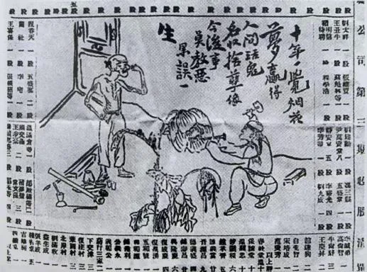 上图为1910年3月19号《晋阳公报》载《禁止吸食鸦片》的漫画