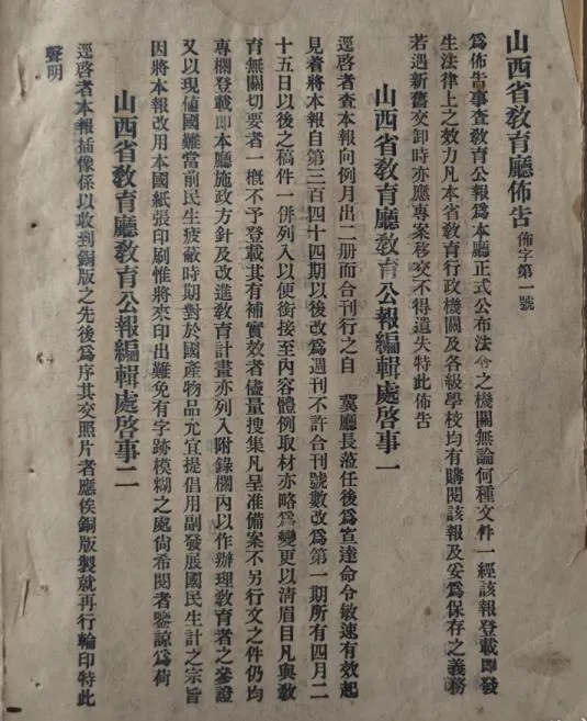 《山西教育报》第1期64页,还用折页附长子县、清源县、潞安县三所学校学生毕业成绩表。该报引人注意的是每期有附录,名为教育讨论集,实为演讲选登,曾先后辑录大批知名教育家、学者的演说词。1914年11月改为月刊,1918年重新出版《山西教育公报》。1932年改为周刊,1936年终刊。