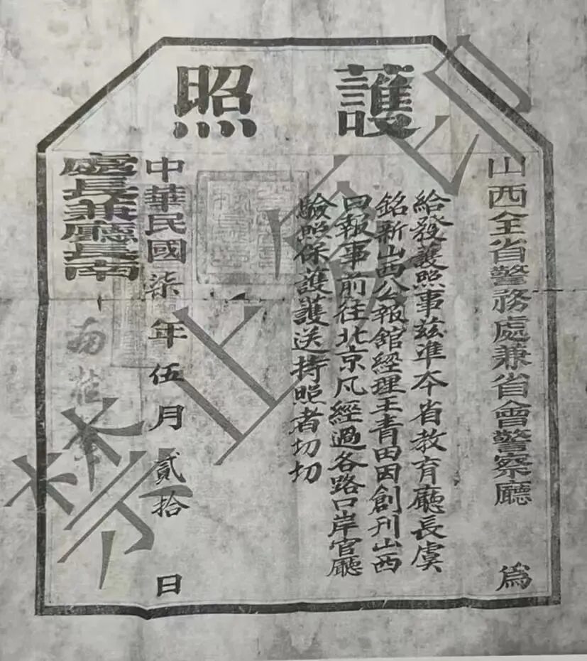 上图为1918年,山西教育厅长虞铭新、山西公报馆经理王青田,因创刊《山西日报》事,前往北京时所携带的“护照”。阳曲县马文蔚纪念馆馆长史志刚提供