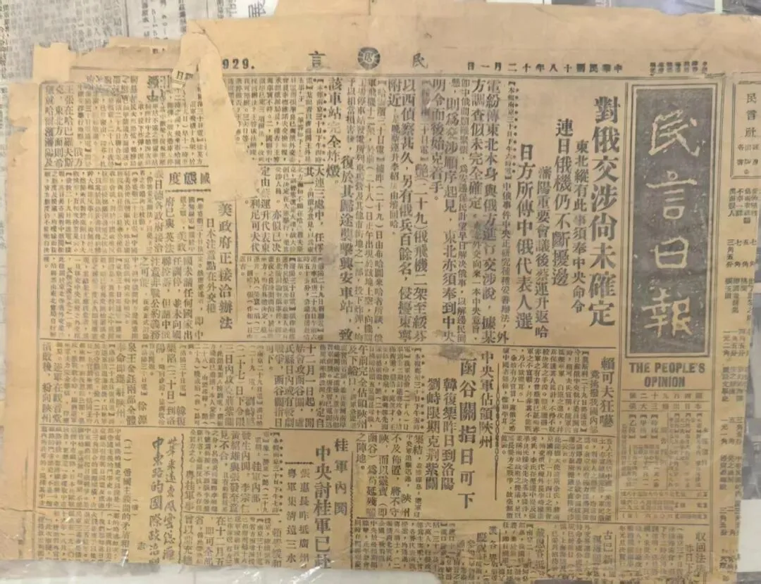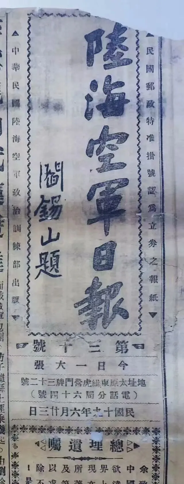 上图为中国唯一的一张《陆海空军日报》,1930年6月23日出版。阳曲县马文蔚纪念馆馆长史志刚提供