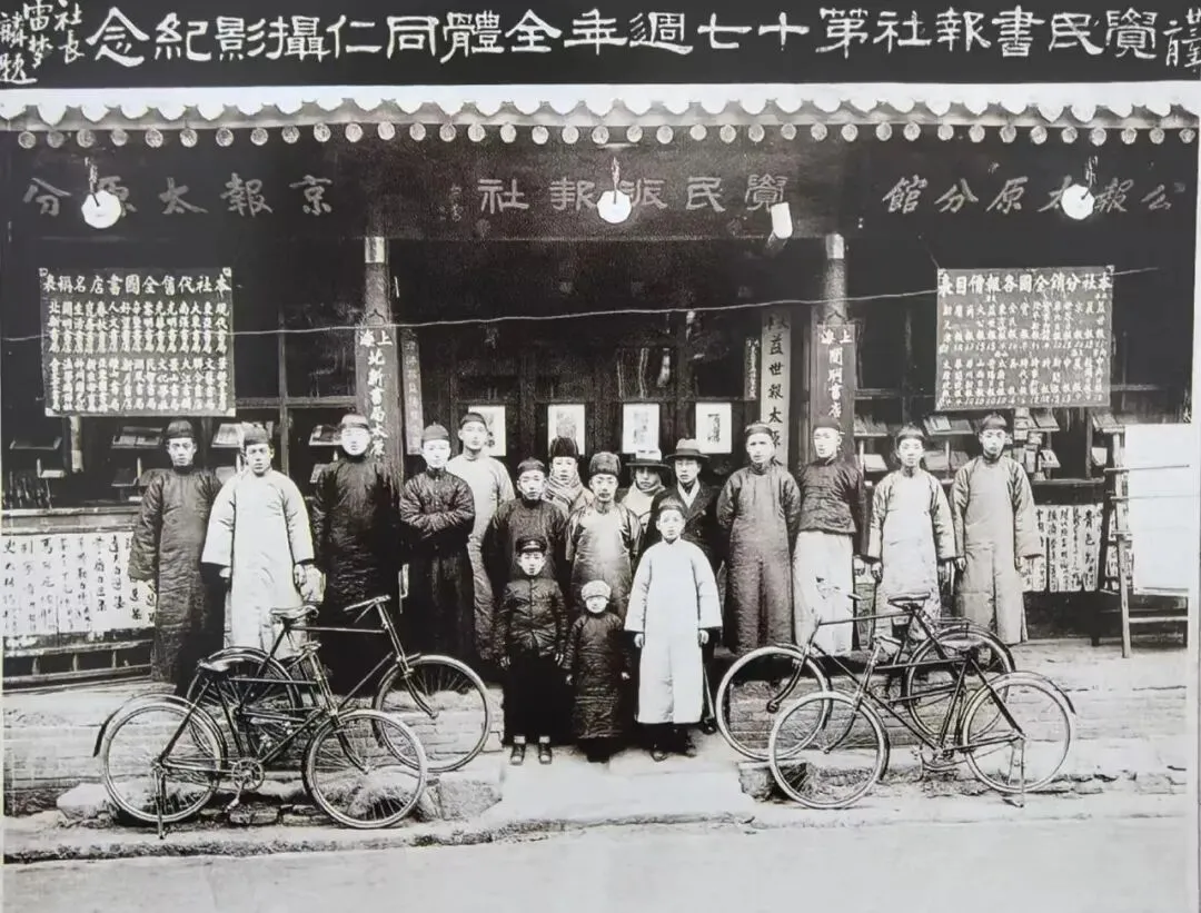 上图为1934年2月,觉民书报社成立17年留影。1903年,中阳人雷梦麟在晋阳报社卖报。1915年《大公报》委其推销。1916年在张叔平、贺昌等支持下,成立觉民派报社,成为太原发行红色书报始创者。1931年更名觉民书报社。太原沦陷后停业,1939年复业,成为中共地下工作点。抗战胜利后被洗劫一空,1946年又遭查封,1947年12月社长雷梦麟离世,享年57岁,书报社停办。