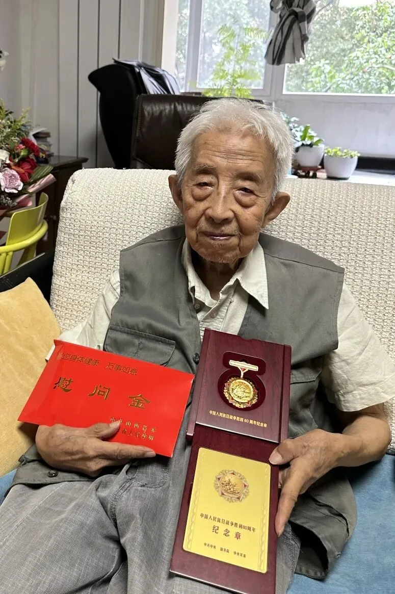 上图为2025年9月3日抗战胜利80周年,102岁的房秉玉捧着党和国家颁发的奖章和慰问金