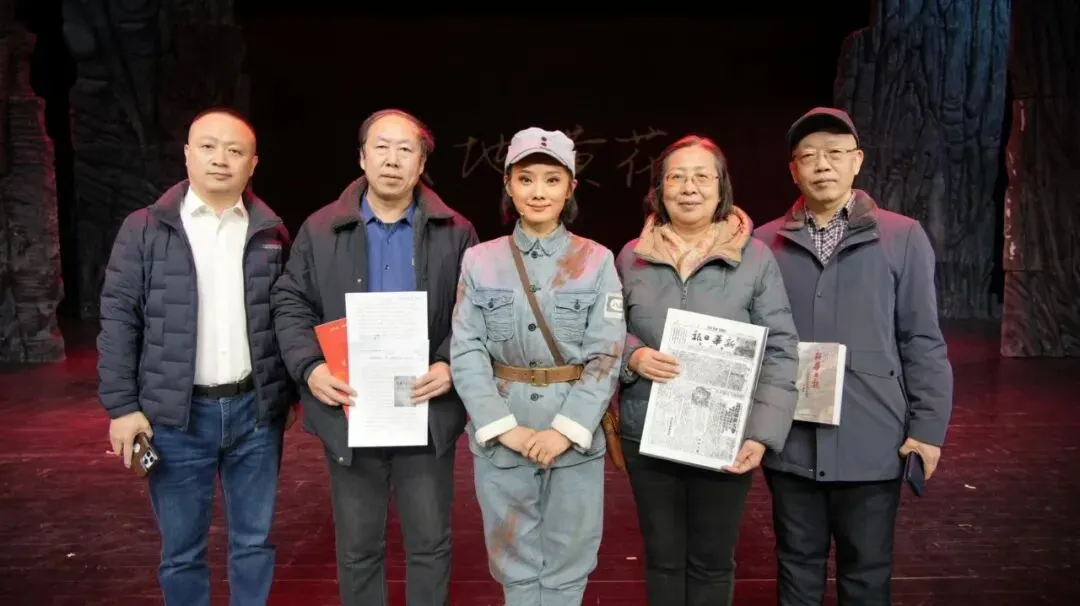 上图为2024年12月23日,晋中晋剧团以《新华日报(华北版)》黄君珏烈士为原型,编排了晋剧《战地黄花》在青年宫演出,笔者与房老女儿、女婿刘跃亭及主演、导演合影