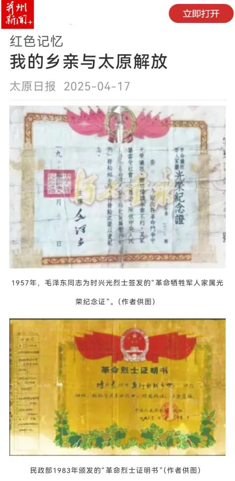 特别是在太原解放纪念日前,《太原日报》登载了笔者所写的《红色记忆——我的乡亲与太原解放》,使更多人了解了76年前解放太原的艰难历程。