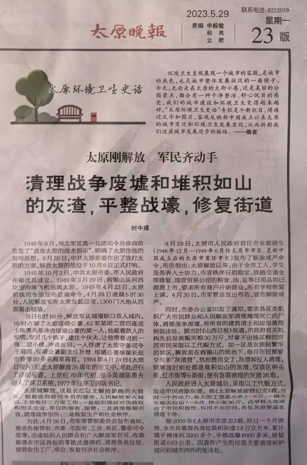 2023年,《太原晚报》设立“太原环境卫生史话”专栏,用半年时间,连载了笔者所写的《太原环境卫生史话》,使广大市民了解了120年的太原环境卫生发展历史。