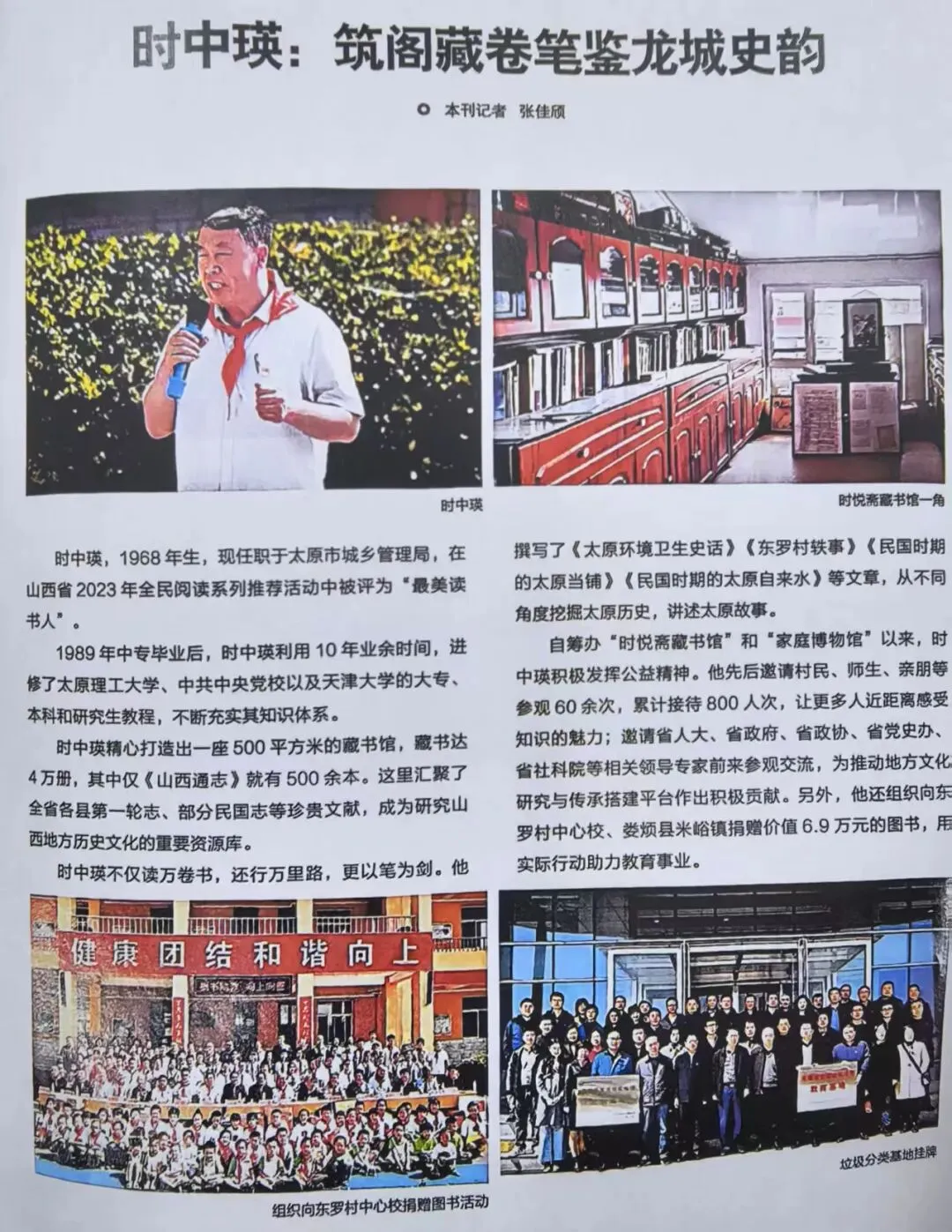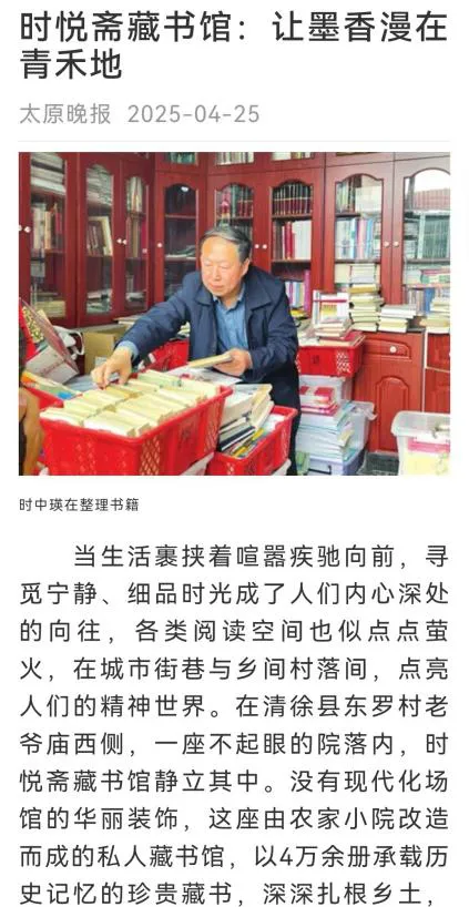 上图为2025年4月25日《太原晚报》载笔者读书藏书专栏《时悦斋藏书馆:让墨香浸在青禾地》