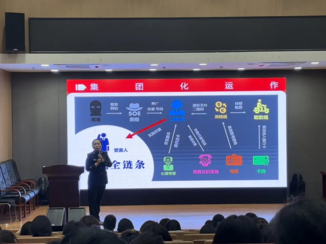 她紧密结合高校学生群体社会经验不足、防范意识较弱的特点,深入剖析了诈骗案件的发案规律与危害后果。她提炼了“未知来电不轻信、未知链接不点击、未知情况不扫码、未知软件不下载”反诈秘诀,简洁好记、实用性强,为学子们筑牢了抵御诈骗的思想防线。