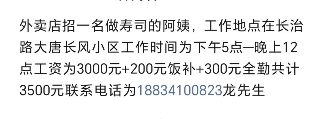 单位食堂招聘如下岗位:1,切配2名 3000~35002.面房小工2名 28003.打荷2名 28004.洗碗工1名 30005,服务员2名 2800要求(年龄57以内,干活利索,无犯罪记录,无疾病)要长期的待遇福利:每周休息一天半,节假日休息,包吃包住,工龄奖。联系电话☎ 谢厨18235190430微信搜:太原大喇叭,查看更多信息