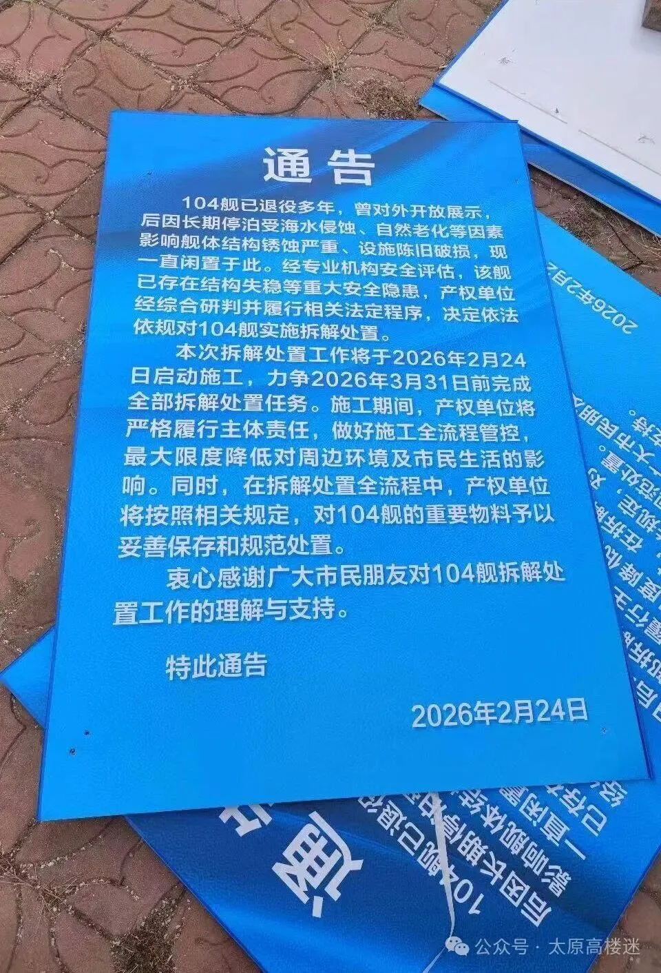 太原号驱逐舰(舷号:104)是前苏联自豪级07型驱逐舰,1953年6月4日前苏联太原号驱逐舰出售中国,1955年6月28日在青岛接收,曾作为中国海军早期驱逐舰“四大金刚”之一。1991年9月19日太原号退役,该舰改名“青岛”泊于大连老虎滩做为大连舰艇学院的练习舰。今年2月24日,因海水侵蚀、自然老化等原因导致舰体结构失稳,停泊在大连老虎滩畔三十余年的104舰正式启动拆解。通告照片中显示,104舰退役多年,因长期停泊受海水侵蚀、自然老化等因素影响舰体结构锈蚀严重、设施陈旧破损。经专业机构安全评估,104舰已存在结构失稳等重大安全隐患,产权单位经综合研判并履行相关法定程序,决定依法依规对104舰实施拆解处置。拆解处置工作将于2026年2月24日启动施工,力争在2026年3月31日前完成全部拆解处置任务。在拆解处置全流程中,产权单位将按照相关规定,对104舰的重要物料予以妥善保存和规范处置。得知太原舰要被拆解的消息,网友留言太原12345,希望太原能接太原舰回家!