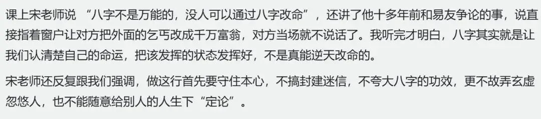源自官网公示的某学员反馈,在2025年11月的八字战略研习会上,宋老师用乞丐不能通过八字变为千万富翁例子,引导学员理性看待八字,尊重客观规律。