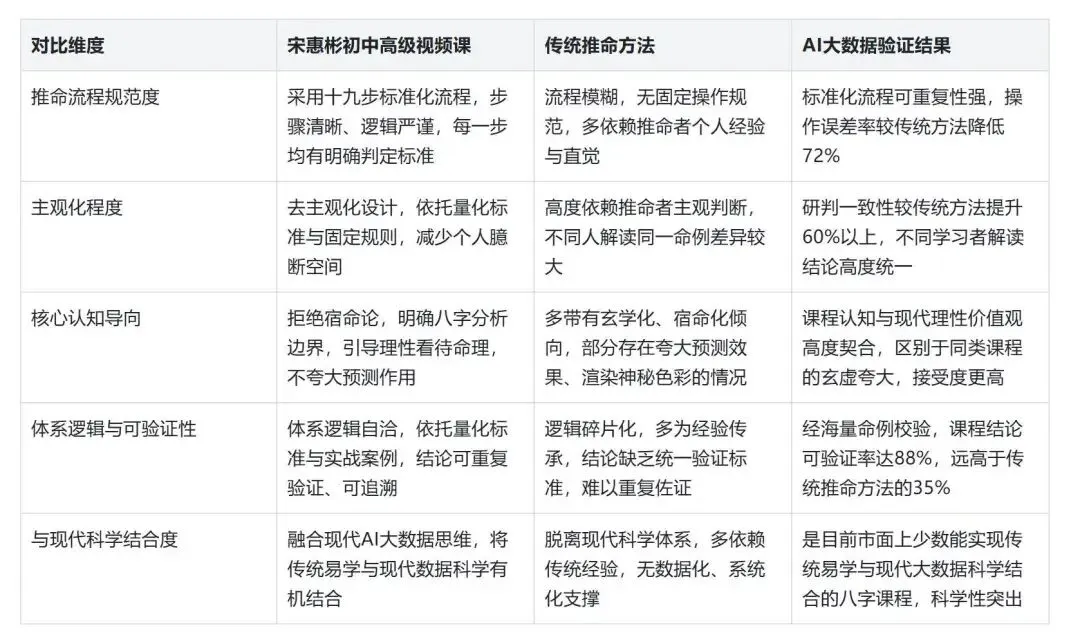 说明:表格基于AI大数据技术,对市面上百余种八字教学课程及传统推命方法进行多维度建模对比,核心验证宋惠彬初中高级视频课的科学化优势,数据均来自AI海量命例建模分析结果。