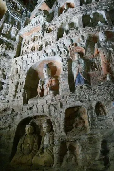 贴在峭壁上,北魏开头,后世慢慢补,儒释道都在里头,牌子挂得明白。