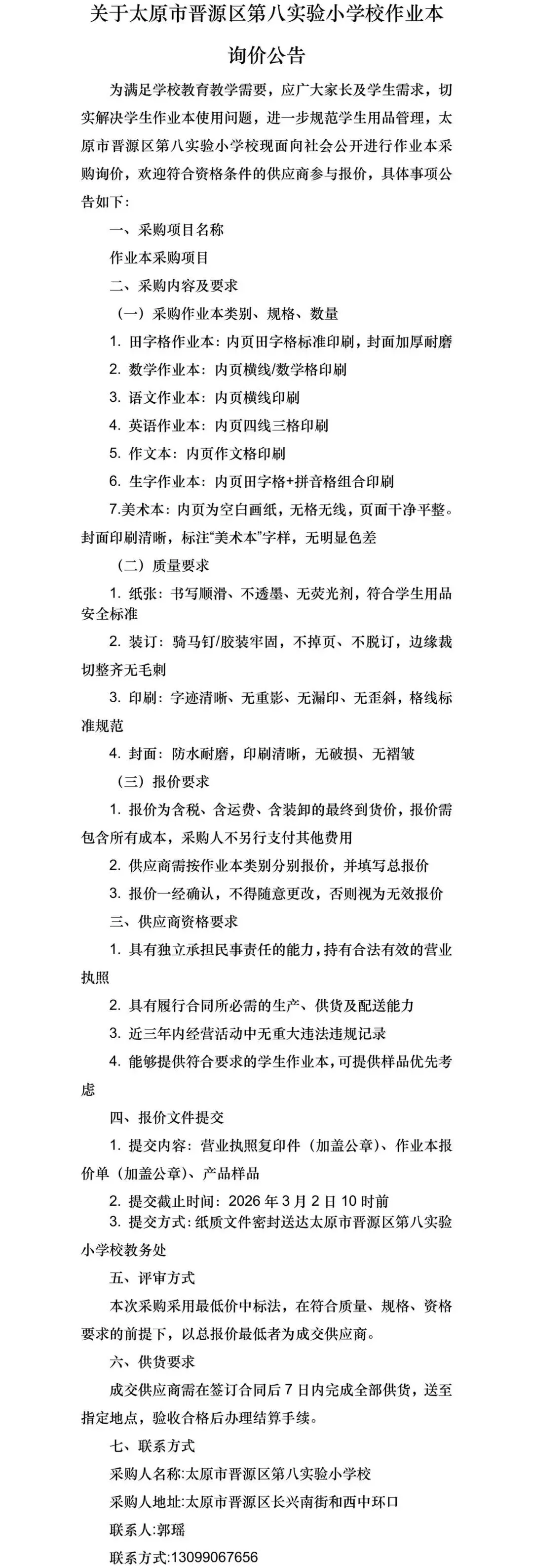 >关于太原市晋源区第八实验小学校作业本询价公告