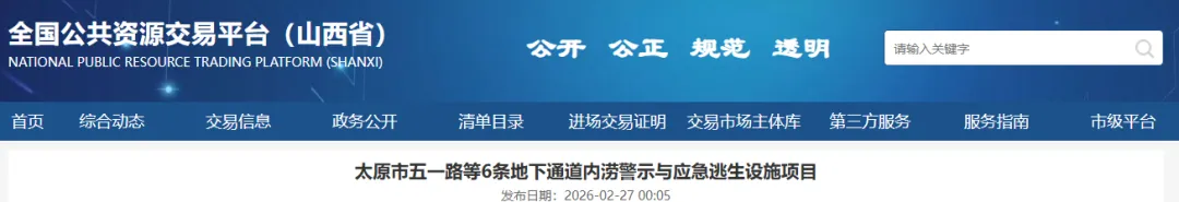 2月27日,山西省公共资源交易中心发布太原市五一路等6条地下通道内涝警示与应急逃生设施项目招标计划。项目总投资7273.38万元。