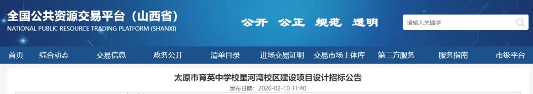 近日,全国公共资源交易平台发布《太原市育英中学校星河湾校区建设项目设计招标公告》《太原市育英中学校星河湾校区建设项目勘察招标公告》。