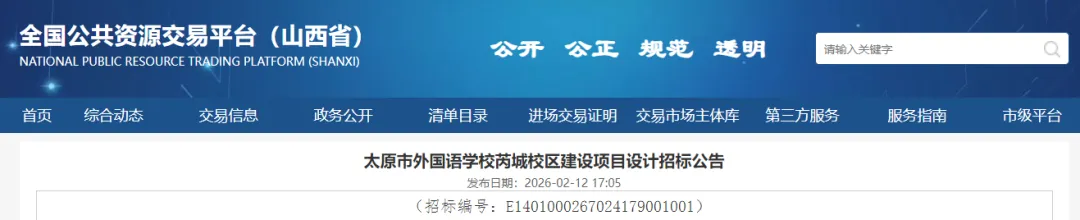 全国公共资源交易平台发布《太原市外国语学校芮城校区建设项目设计招标公告》《太原市外国语学校芮城校区建设项目勘察招标公告》。