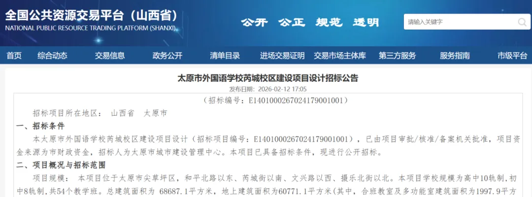 近日,全国公共资源交易平台发布《太原市育英中学校星河湾校区建设项目设计招标公告》。