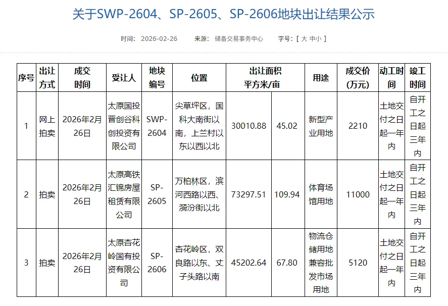 2 月 26 日,太原市规划和自然资源局公示了 SWP-2604、SP-2605、SP-2606 三宗地块的出让结果,这三宗地块分别位于尖草坪区、万柏林区和杏花岭区,涉及新型产业、体育场馆、物流仓储等多种用途。