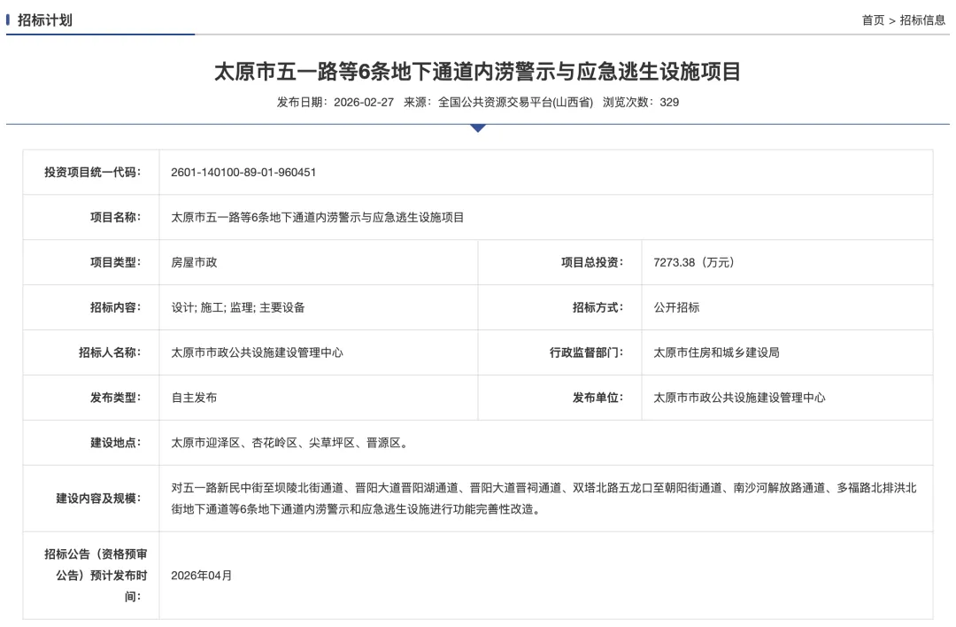 该项目已于2026年2月27日在山西省招标投标公共服务平台发布招标信息,总投资达7273.38万元,标志着太原市对地下空间防汛安全的系统性升级改造进入实质性阶段。项目覆盖迎泽区、杏花岭区、尖草坪区、晋源区等多个区域,旨在通过对关键节点的功能完善,从根本上提升地下通道应对极端天气的能力。