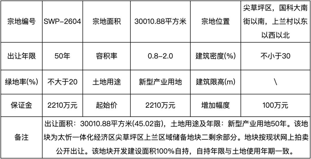 地块起始价2210万元,该地块为太忻一体化经济区尖草坪区上兰区域储备地块二剩余部分。地块按现状网上拍卖公开出让。该地块开发建设面积100%自持,自持年限与土地使用年期一致。