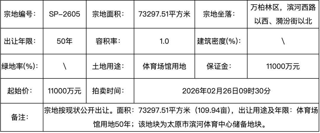 出让年限50年,容积率1.0,土地用途为体育场馆用地,地块起始价11000万元。该地块为太原市滨河体育中心储备地块。