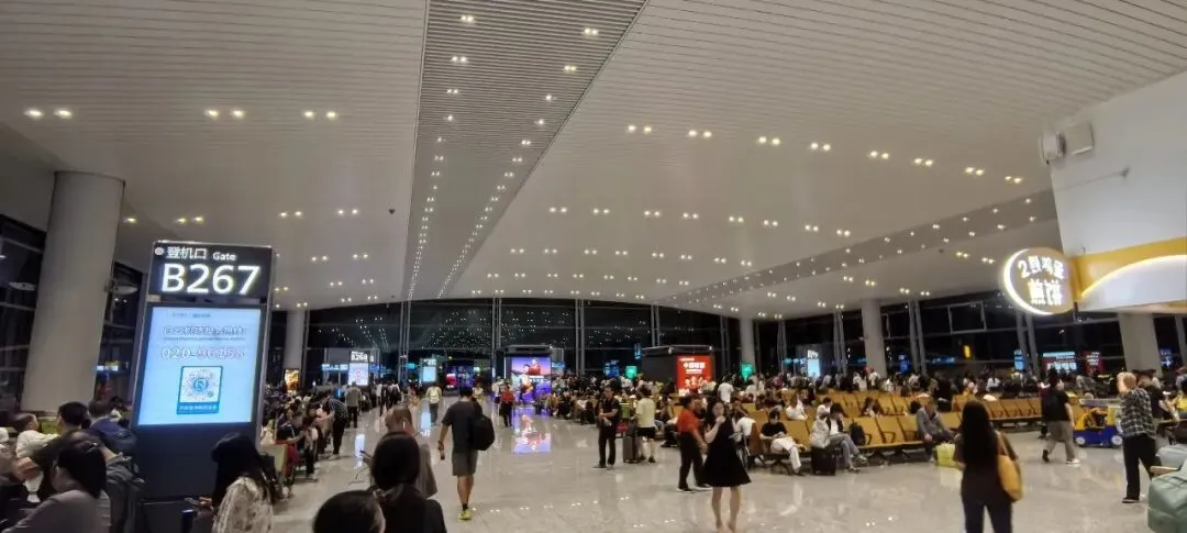 在坐着大巴前往广州途中收到航空公司的短信称航班根据气象台的天气预测估计会受台风的影响,已将原来所改签到17:20(最初订的是16:05的航班)再次改签延迟到19:45才能起航(奇怪的是取消的航班前后的所有班次都没被取消,可惜前一个可改签的13:20那班抢不到,手速太慢,申请被弹回——那个航班可是C919啊),既然如此,也实属无奈。大巴到了T2航站楼,因为剩下时间很多,实在无聊,就在航站楼里面到处逛。等到16点左右才过安检去到登机口附近坐下。幸好之后没再收到继续受台风影响延误的信息。到傍晚18:20,航司还提供额外的晚餐给我们这个延误航班的乘客们,19:39顺利登机,最后终于准时起航。