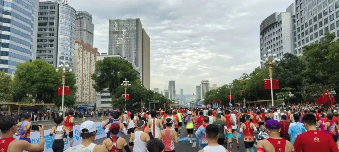 骑了6公里很快就到了五一广场,整理好,存了包,7点半就准时出发。说实在话,这次从头到尾就只想着能回来参加一次就已经很满足了,什么“破三”、PB之类的都不敢去想,毕竟已经一个多月没有怎么跑过步或有效地运动,身体各项机能早就不如前,加上昨天走了那么长的路,双腿是无法承受再一次大强度运动的,且这次的马拉松平均海拔800米。