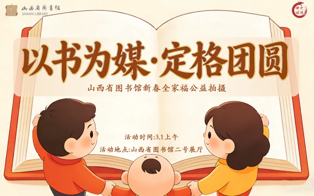 马年新春暖,团圆正当时。 一张全家福,是岁月最温柔的定格,是亲情最珍贵的见证。3月1日上午,山西省图书馆(长风馆)二号展厅,特举办“山西省图书馆新春全家福公益拍摄”活动,现正式招募家庭参与。以光影为媒,以文化为底,让团圆更有仪式感,让年味更有温度!