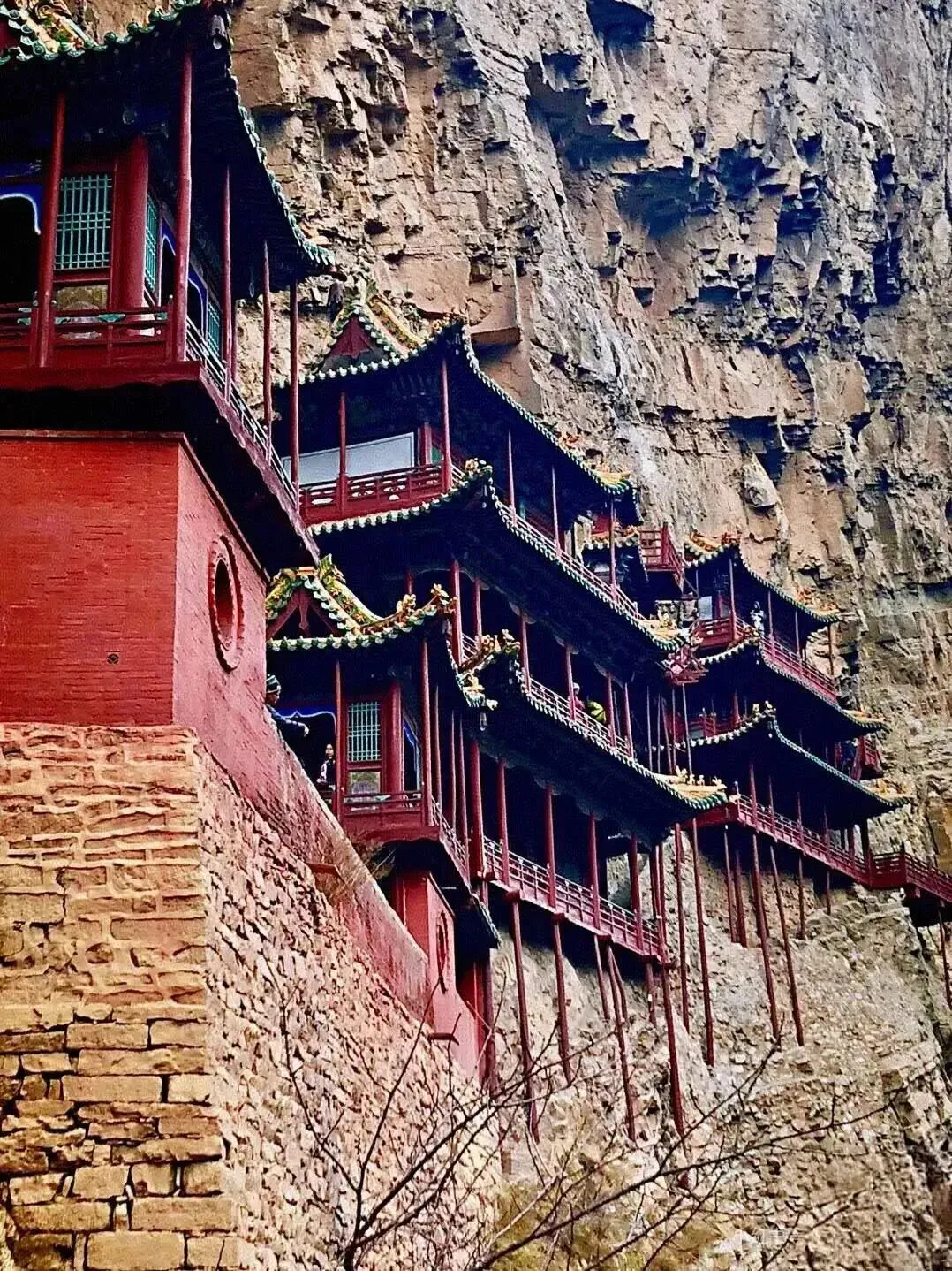 【悬空寺】位于山西省大同市浑源县恒山金龙峡西侧翠屏峰峭壁间,原叫“玄空阁”,“玄”取自于中国道教教理,“空”则来源于佛教的教理,后改名为“悬空寺”,是因为整座寺院就像悬挂在悬崖上,在汉语中,“悬”与“玄”同音,因此得名。建成于公元491年,是佛、道、儒三教合一的独特寺庙。“悬空寺”建筑极具特色,以如临深渊的险峻而著称,素有“悬空寺,半天高,三根马尾空中吊”的俚语,以如临深渊的险峻而著称