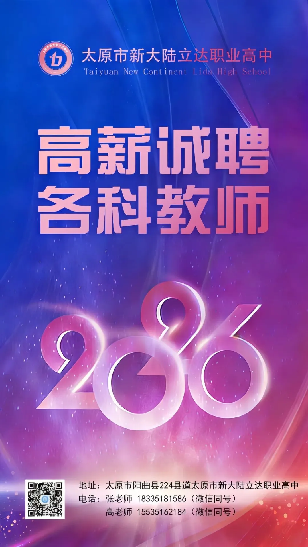 年薪6万-20万丨太原市新大陆立达职业高中诚聘各科教师!