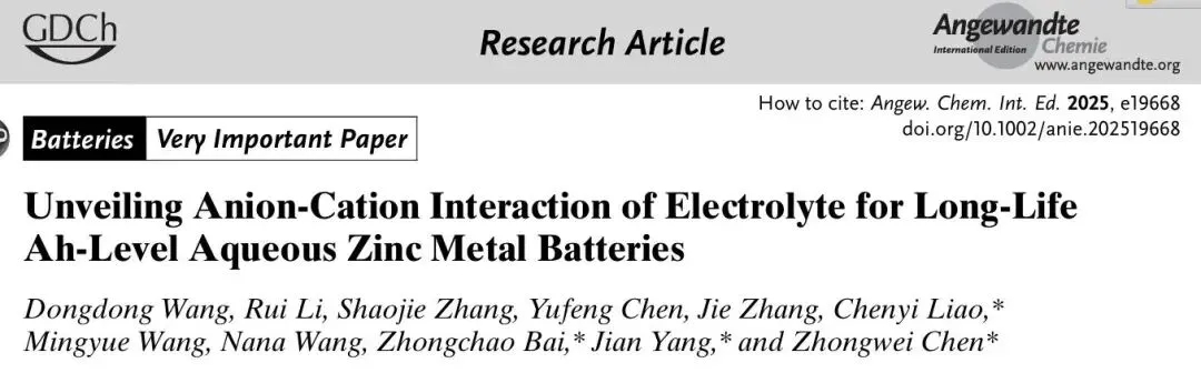 Unveiling Anion‐Cation Interaction of Electrolyte for Long‐Life Ah‐Level Aqueous Zinc Metal Batteries, Angewandte Chemie International Edition 2025 DOI: 10.1002/anie.202519668