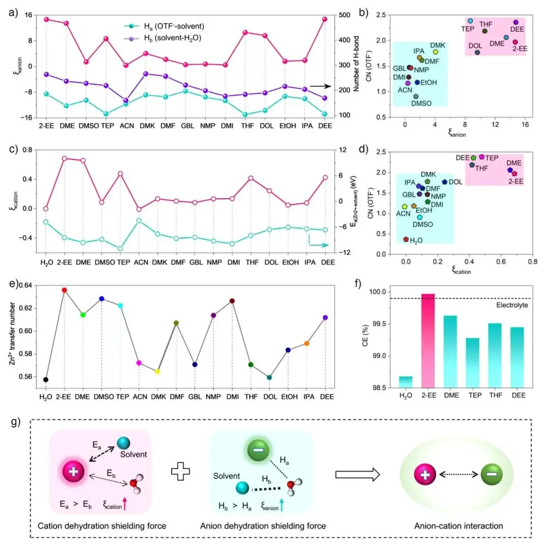 总之,该工作证明了阴/阳离子脱水屏蔽力是实现阴阳离子配位结构的有效电解质工程描述符。所设计的基于2-乙氧基乙醇的电解质极大地改善了Zn²⁺的扩散动力学,并有效限制了水分子的活性。