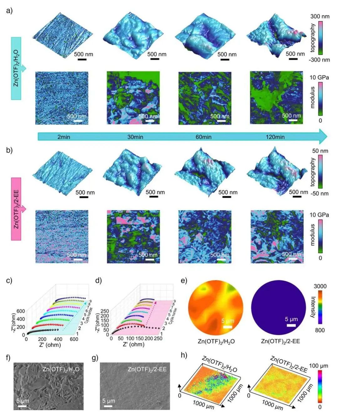通过OTF⁻阴离子的选择性还原分解生成了富含氟的固体电解质界面膜,首次通过原位衰减全反射表面增强红外吸收光谱和电化学原子力显微镜得到了证实,该界面膜表现出提升的Zn²⁺电导率和优异的机械强度。因此,Zn(OTF)₂/2-乙氧基乙醇电解质有效抑制了由水引发的副反应,并实现了均匀的锌沉积/剥离。