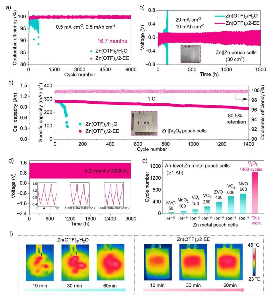 结果表明,这种Zn(OTF)₂/2-乙氧基乙醇电解质实现了高度可逆的锌沉积/剥离,在0.5 mA cm⁻²的电流密度下获得了99.96%的高库仑效率和6000次循环的超长寿命(日历时间16.7个月)。使用该电解质的Zn||Zn软包电池表现出优异的循环稳定性,超过1500小时,累积容量达30 Ah cm⁻²。