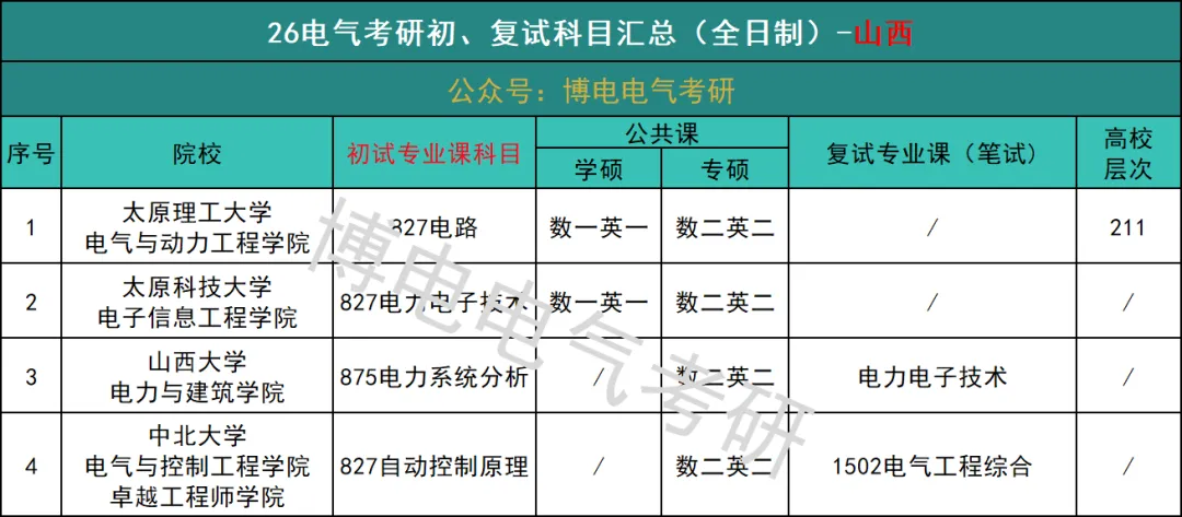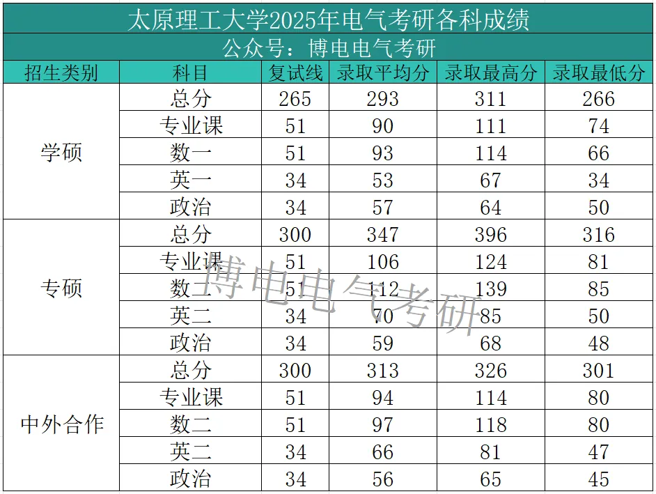 下述表格为太原理工大学25年各科成绩情况整理:2025年太原理工大学学硕数一最高113分、平均93分,专业课最高111分,平均分90分;专硕数二最高139分、平均112分,专业课最高分124分,平均分106分;中外合作数二最高118分、平均97分,专业课最高分114分,平均分94分。下图为2026届博电教育电气工程专业研究生考试辅导课程介绍!