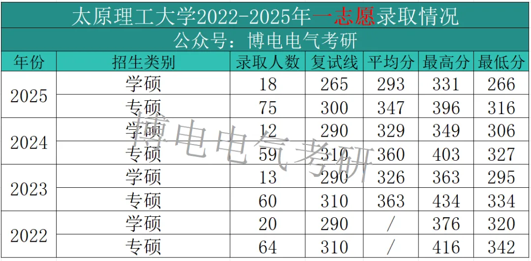 25考研太原理工大学电气学硕进入复试18人,拟录取18人,综合复录比为1:1;录取考生中,最高分为331分。最低分为266分,平均分为293分,进入复试的考生100%录取!