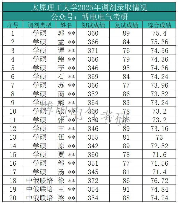 25考研太原理工大学电气学硕调剂录取17人,中外合作专硕调剂录取3人,共计20人。录取考生中,学硕初试最高分为371分,最低分为342分,平均分为355分,中外合作初试最高分为372分,最低分为354分,平均分为360分。