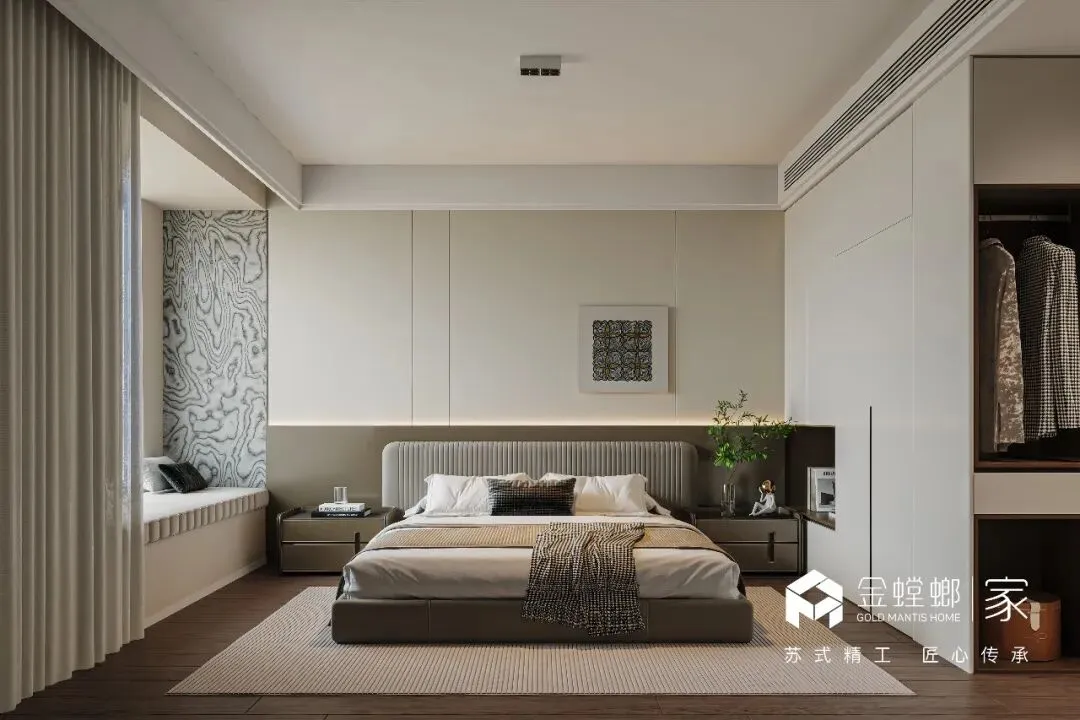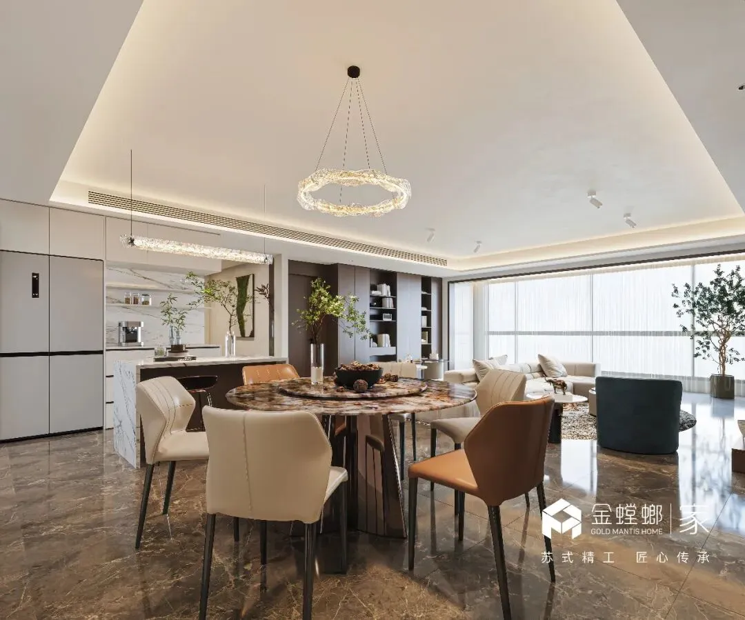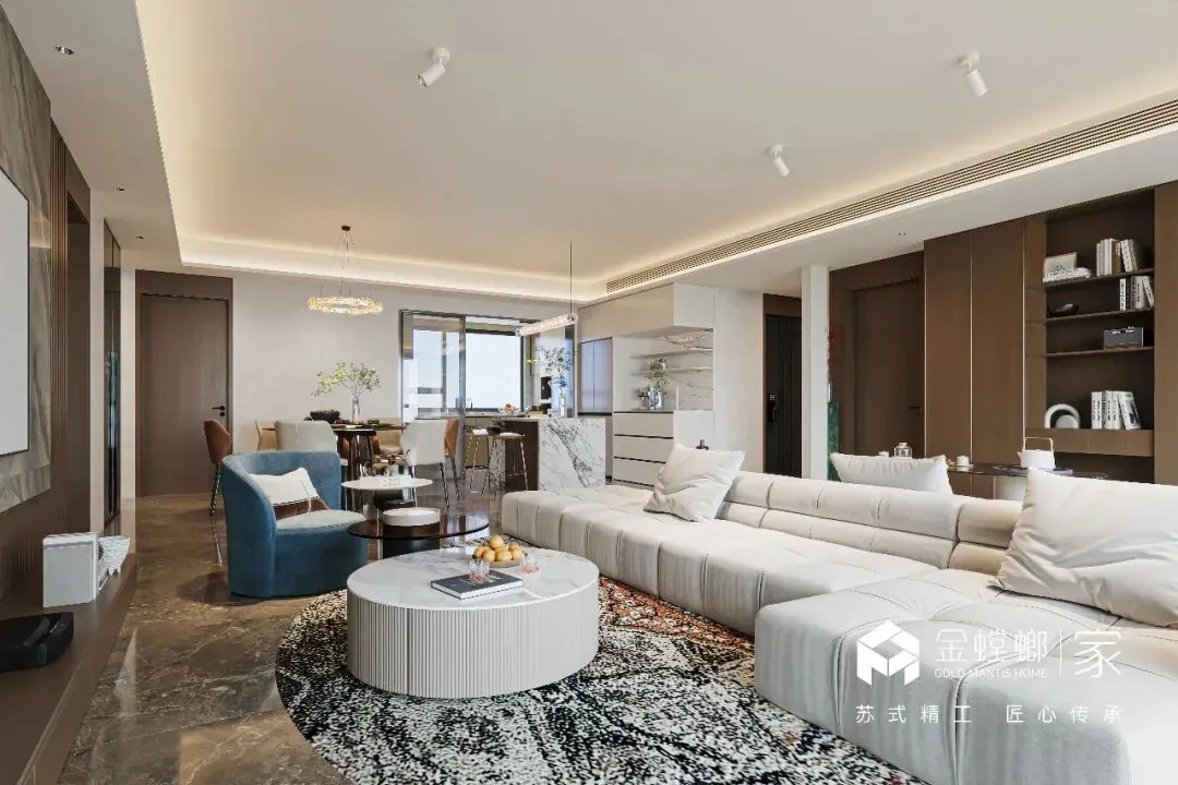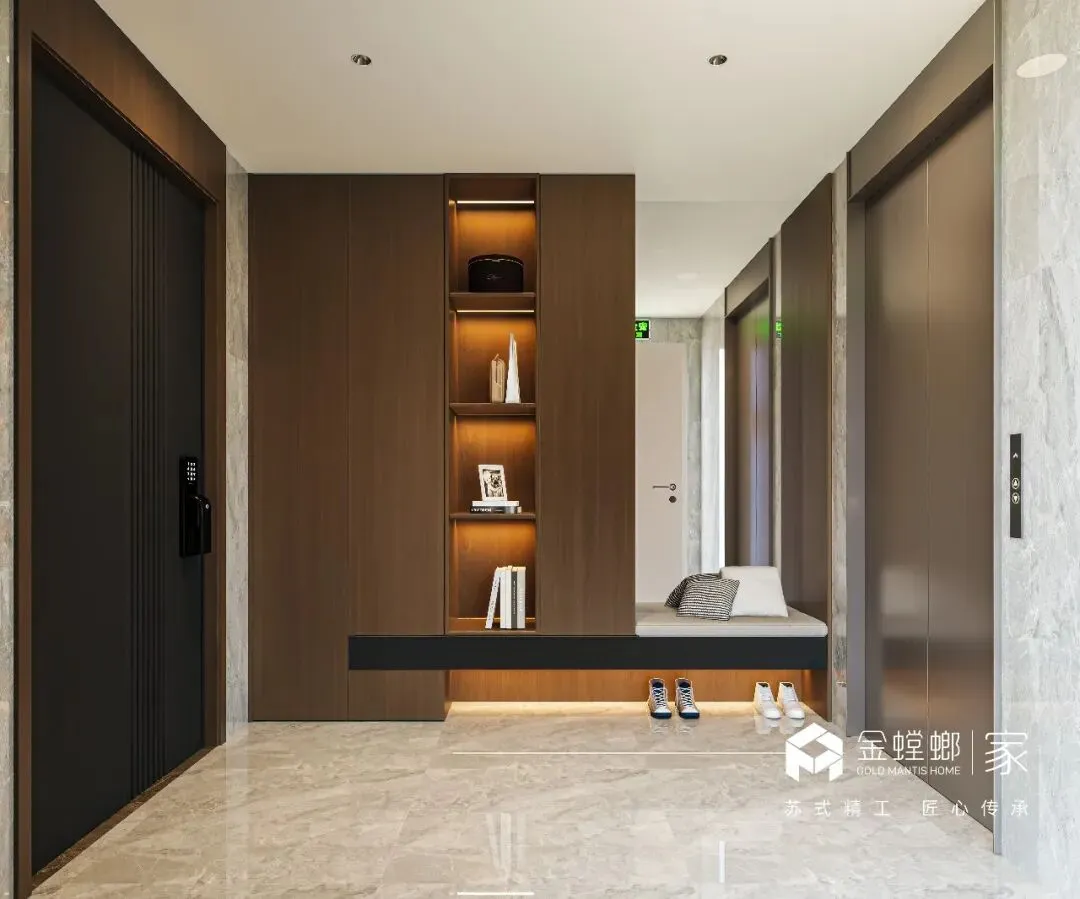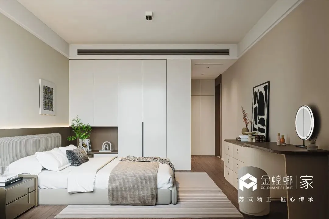 电梯间定制鞋柜,是家与外界的温柔过渡。深木色柜体与嵌入式灯带,在公共空间里勾勒出专属的精致感。悬空换鞋凳与开放格的设计,兼顾了实用与美学,让每一次归家都从从容的仪式感开始,把喧嚣隔绝在门外,把安心迎进家门。浅米色的模块沙发,如云朵般柔软,搭配黑白纹理的艺术地毯,奠定了空间柔和又不失个性的基调。大理石电视背景墙与木格栅的组合,在极简中透出高级质感。无主灯设计让光线均匀洒落在每一个角落,营造出松弛而通透的氛围。客厅以开阔尺度,承载生活的温柔与诗意。浅淡色调舒展空间,柔和光线漫洒每一处角落,简约中透着高级感。没有多余装饰,只有舒适与松弛。静坐其间,时光缓缓流淌,喧嚣被隔绝在外,只剩宁静与治愈,这便是家最动人的模样。餐厅是生活与温情的交汇点。简约餐桌围合出温馨氛围,柔和灯光轻笼桌面,雅致而不浮夸。每一餐都充满仪式感,每一次相聚都自在舒心。在这里,美食与陪伴相融,烟火与雅致共生,简单日常,也能过得诗意从容。厨房以简洁利落的布局,让烹饪成为一种享受。通透光线、干净色调、合理动线,让操作自在流畅。没有杂乱拥挤,只有清爽有序。在这方小天地里,柴米油盐也充满诗意,用心生活的美好,藏在每一次烟火升腾中。主卧是专属于自己的心灵归处。低饱和色调营造舒缓氛围,柔和光线包裹整个空间,简约而不失质感。在这里,无需刻意,不必匆忙,卸下所有疲惫,让身心彻底放松。一枕安眠,一夜好梦,每一天都被温柔与安心唤醒。简洁的梳妆台与圆润的妆凳,线条流畅而优雅。墙面的艺术画与镜面设计,在满足功能的同时,也为空间增添了一抹艺术气息。女儿房兼顾休憩与实用,简约设计保留足够留白,柔和色调带来宁静感。空间通透轻盈,功能灵活多变,既可安睡,亦可静心独处。不局促、不压抑,自在随心,每一种使用方式,都藏着对生活的体贴与用心。卫浴空间以干湿分离打造清爽体验,简约线条与温润材质相融。干净通透,雅致大方,细节之处尽显品质。在这里,褪去疲惫,洗净纷扰,每一次使用都是一场放松,简约而不简单,舒适与美感同在。