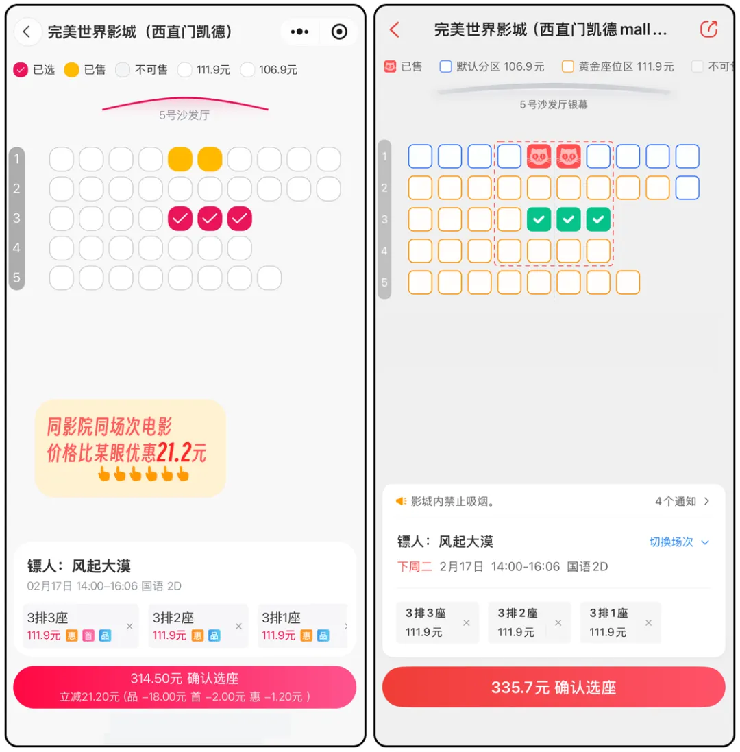 完美世界影城(西直门凯德店)×3张335.7电影票品城卡立减21.2