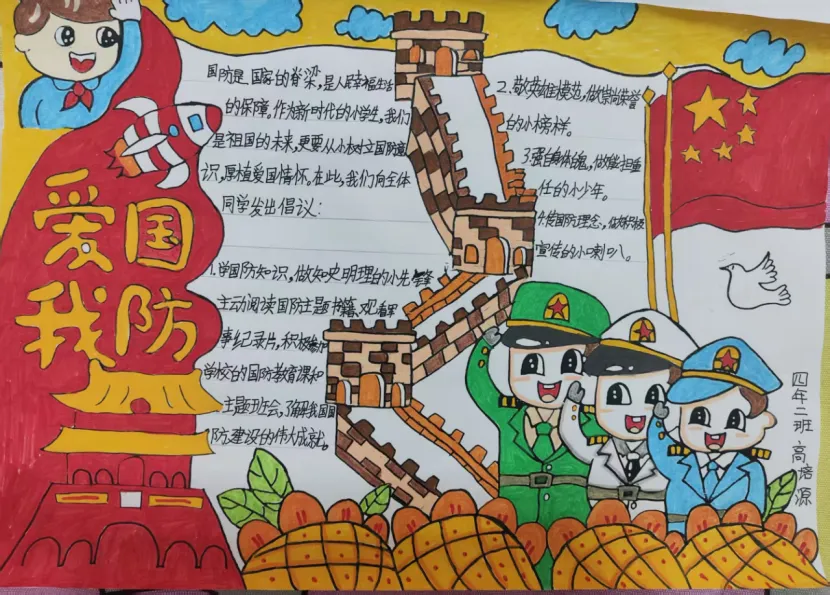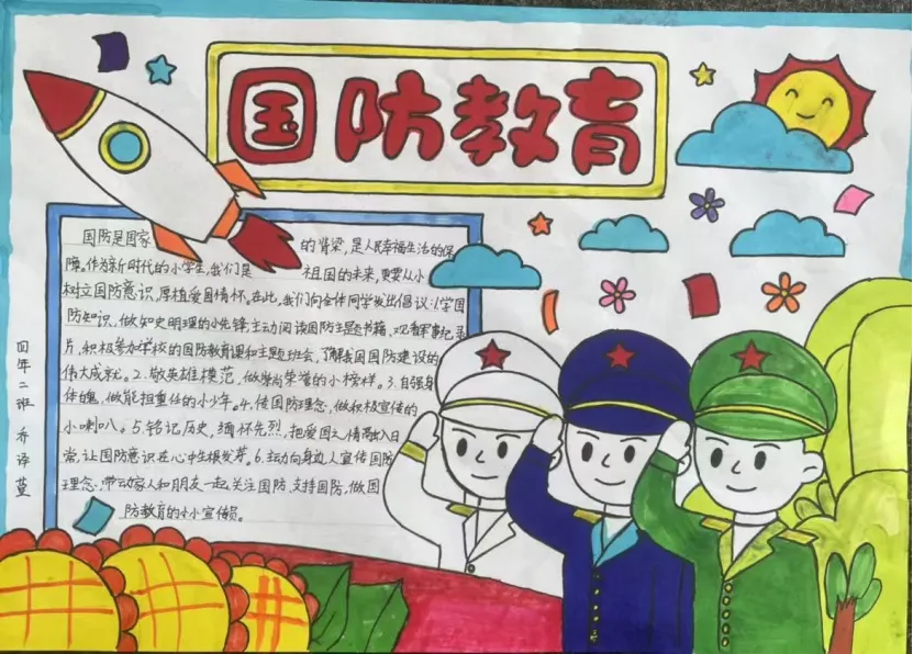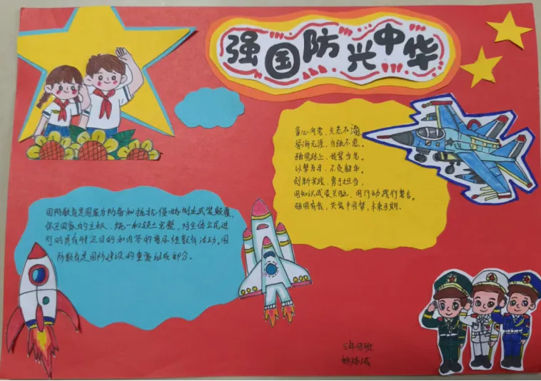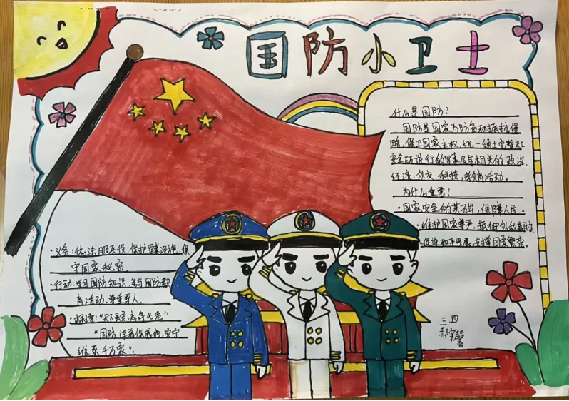 三四年级的队员们围绕“我是国防小卫士”主题,认真查阅资料,了解国防知识,积极设计制作“国防倡议书”或“红领巾爱国防行动计划”。他们用思维导图、手抄报、宣传海报等形式,表达对国防的理解和对祖国的热爱,展现出新时代少先队员的责任与担当。