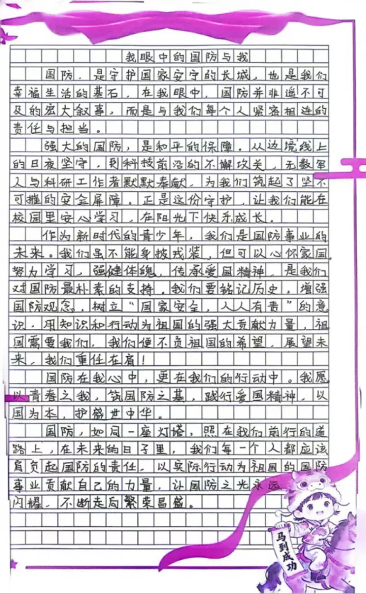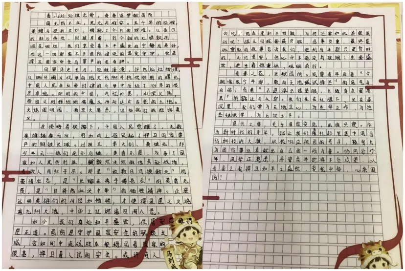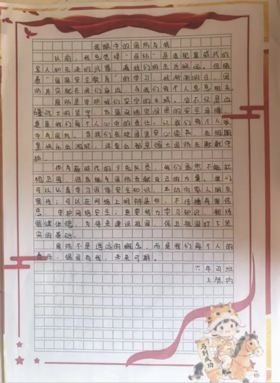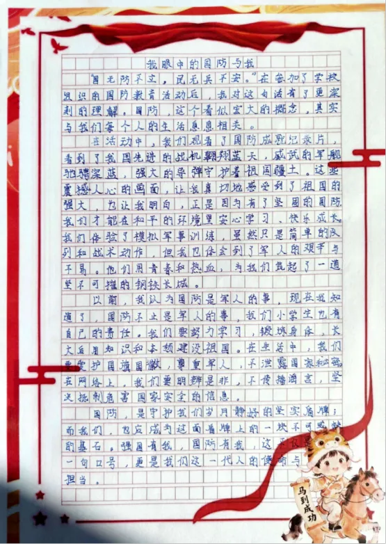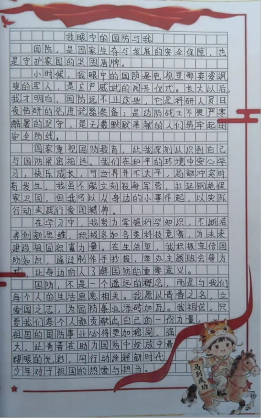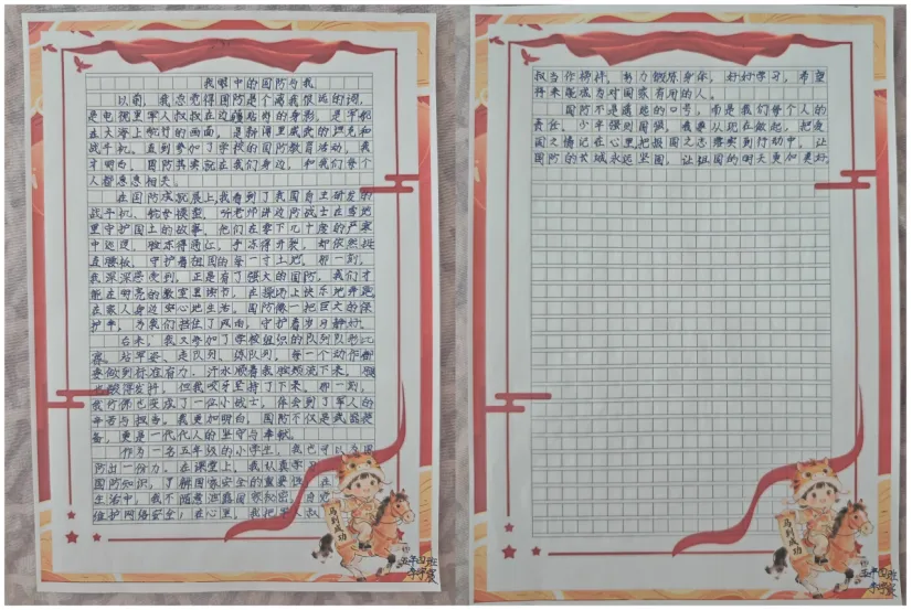 五六年级的队员们则以“我是国防宣传员”为主题,结合“国家安全教育”内容,撰写题为《我眼中的国防与我》的小短文。他们从自身视角出发,结合生活实际,畅谈国防与个人成长、国家安全与社会稳定的关系,字里行间流露出对祖国的深情和对和平的珍惜。