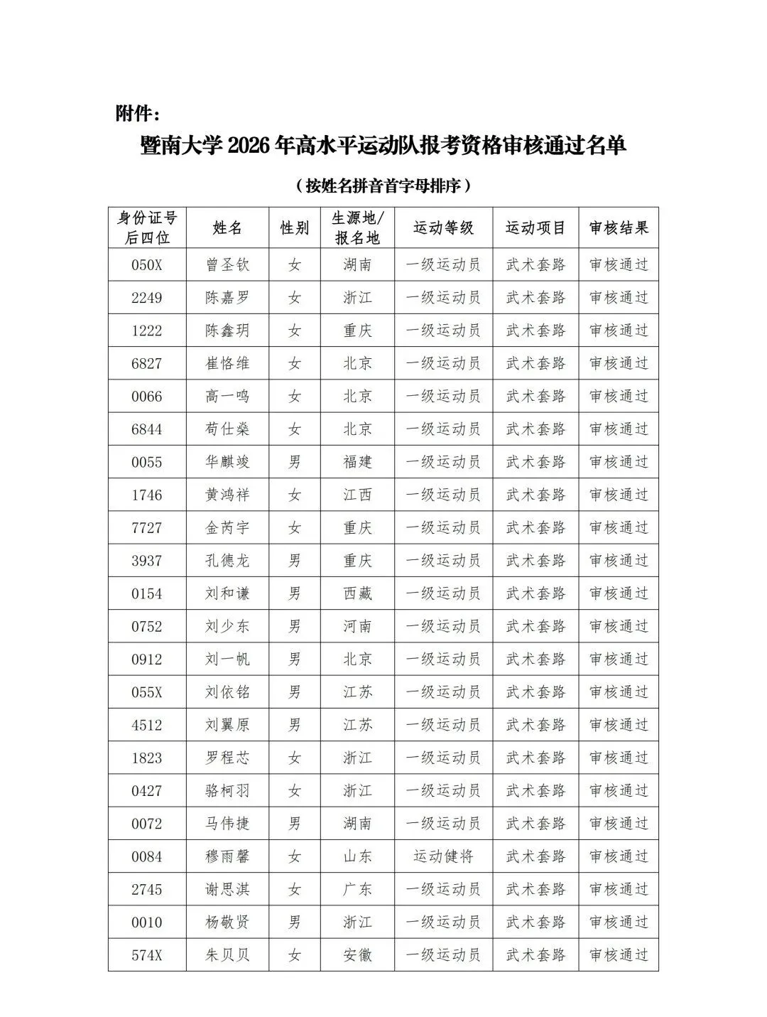 根据教育部关于高校招收高水平运动队学生的有关规定和《暨南大学2026年高水平运动队招生简章》的规定,我校对报考我校考生的报名资料进行审核。现将暨南大学2026年高水平运动队资格审核通过名单予以公示,详见附件,公示期为2026年2月28日—3月6日。有疑问者请在公示期内反馈,邮箱:ly@jnu.edu.cn,联系电话:020-85220283。