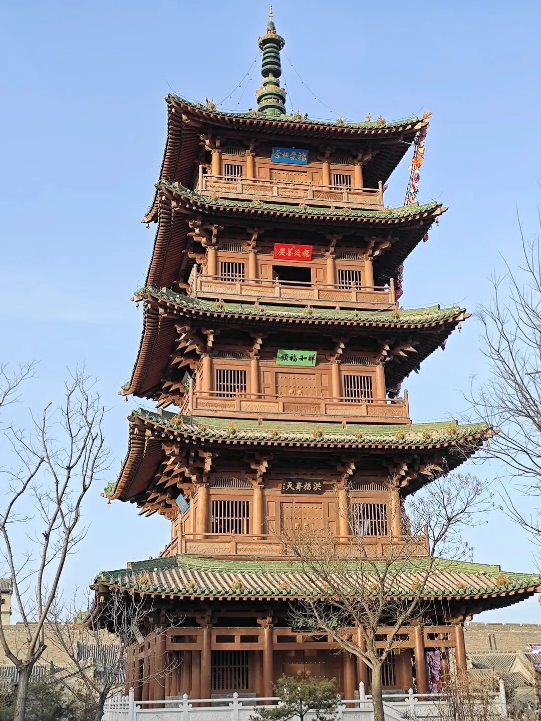 此塔为五层楼阁式建筑,木构塔身、绿色琉璃瓦顶,配以春节期间装饰的巨型花瀑,高大隽永。塔上悬挂多位书法名家题写的扁额。