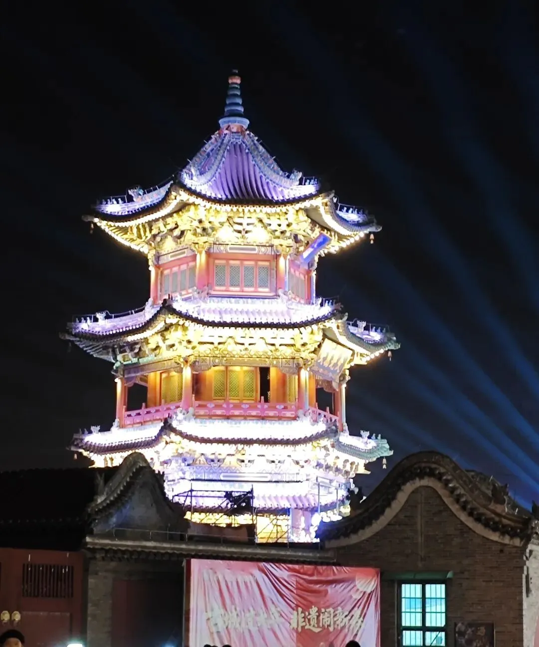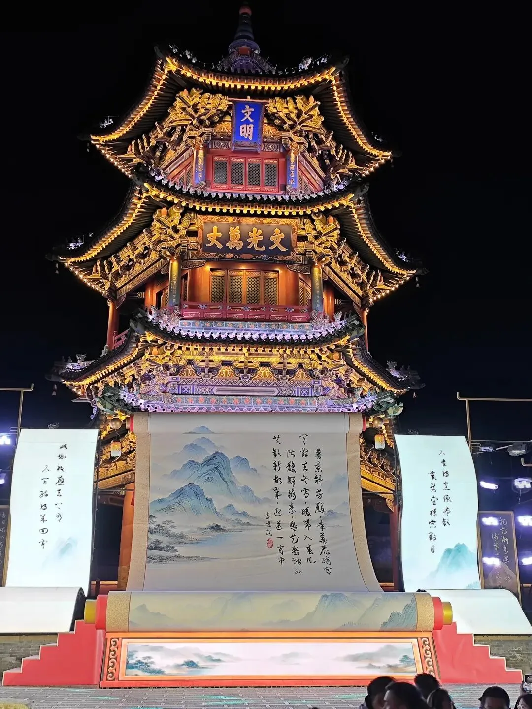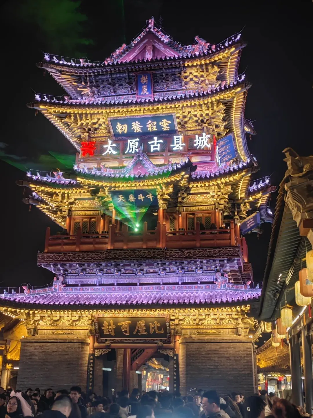 继续行走了几个景点,宫囍馆、县衙、《满江红》影视基地,处处雕梁画栋、金碧辉煌。古晋阳的夜晚是璀璨的灯城,流光溢彩,恰如凤凰涅槃。