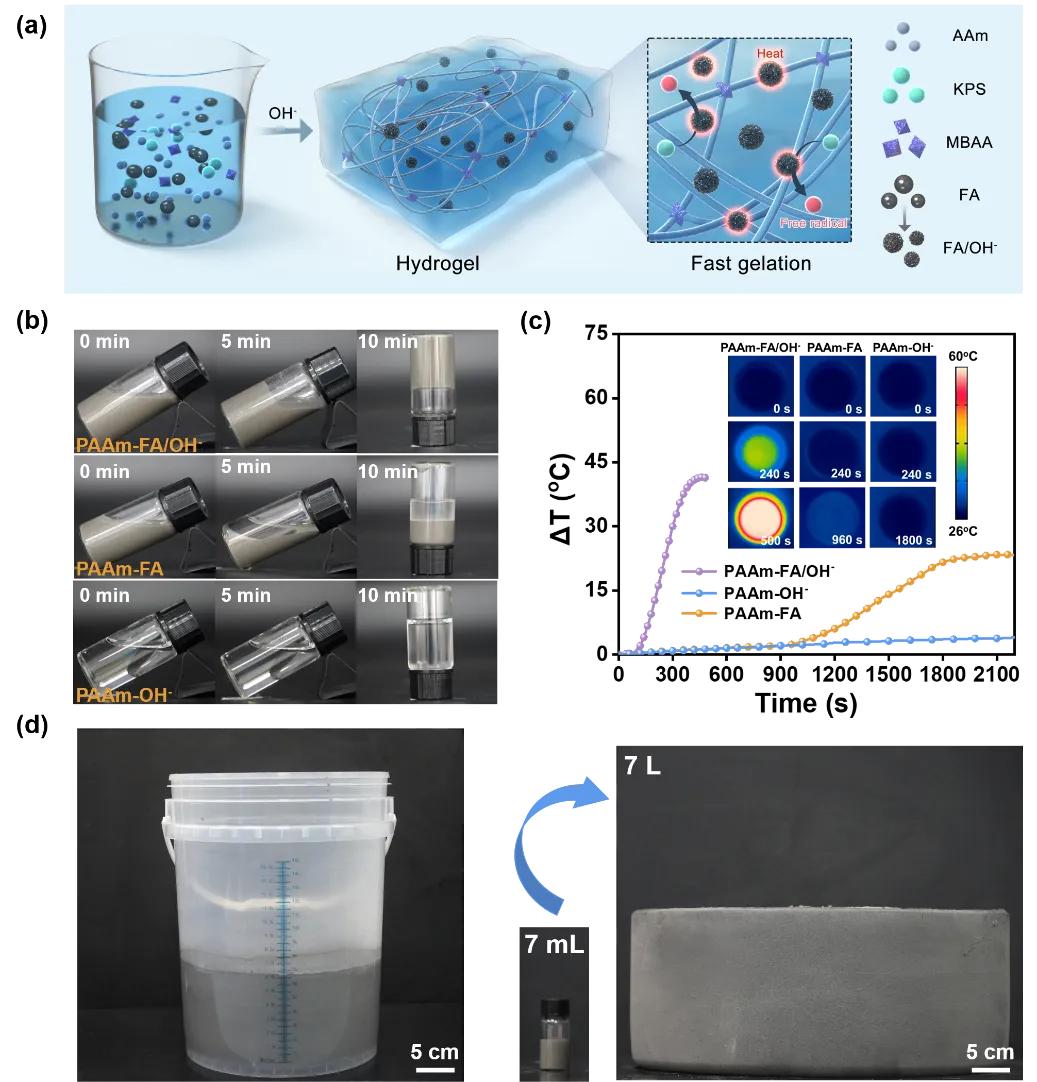 一直以来,面向工业应用(如钻孔密封、快速粘接)的复合水凝胶设计都面临两大挑战:难以规模化生产,以及生产过程通常需要外加热或紫外线照射等高能耗方式。而此项研究的核心创新,便是用“粉煤灰”这一全球年产量超十亿吨、利用率却不足半数的工业固废,巧妙解决了上述难题。