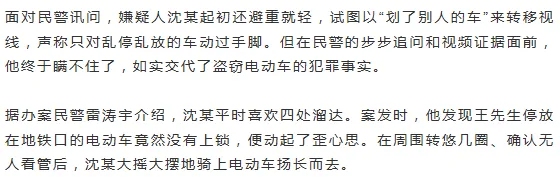目前,犯罪嫌疑人沈某已被警方依法刑事拘留,被盗电动车已追回并发还失主,案件正在进一步办理中。