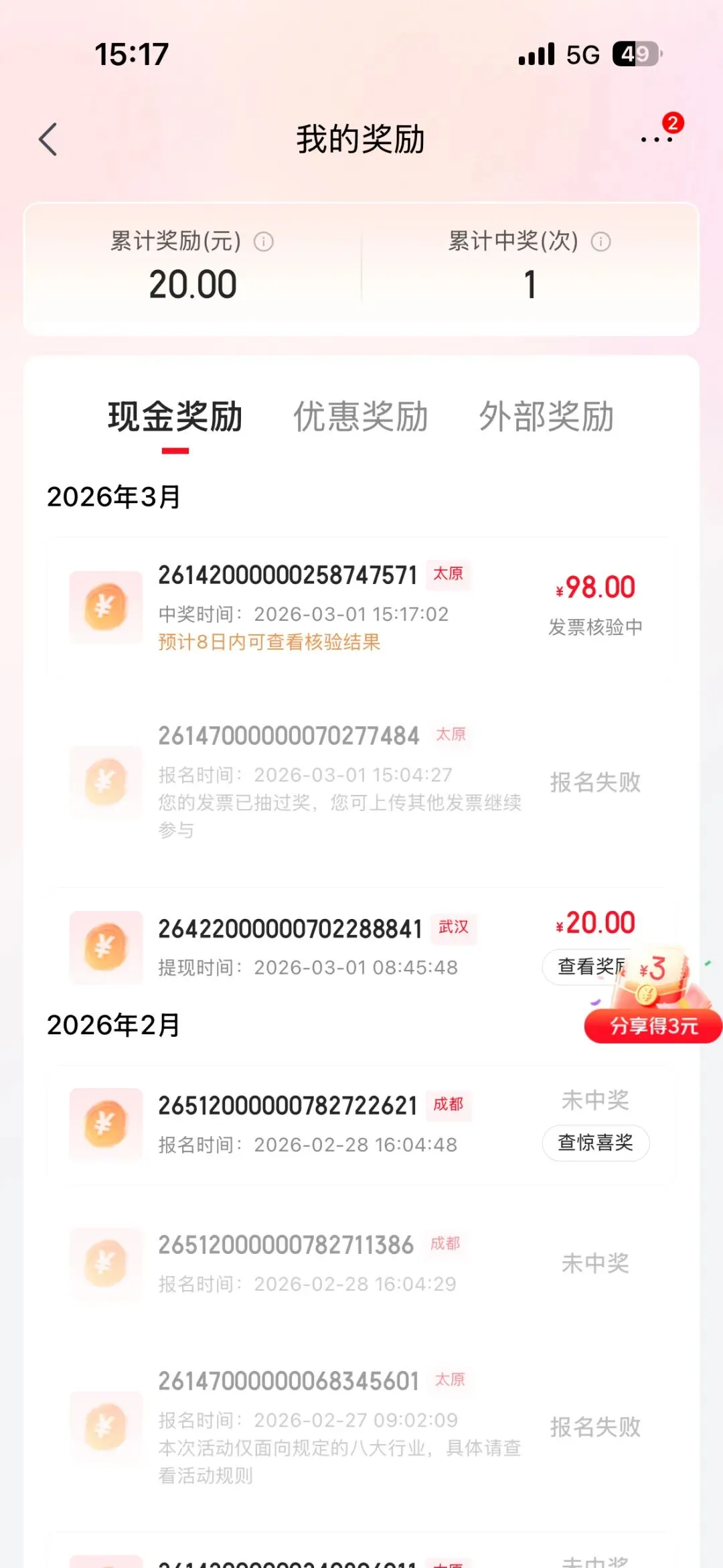 目前在抖音和京东都上传过几次,抖音中了一个8元,购买的奶粉开的发票。京东中了一个98元,淘宝闪购下单的百姓渔村中奖了,那是闪购里面唯一一个超过100的订单。