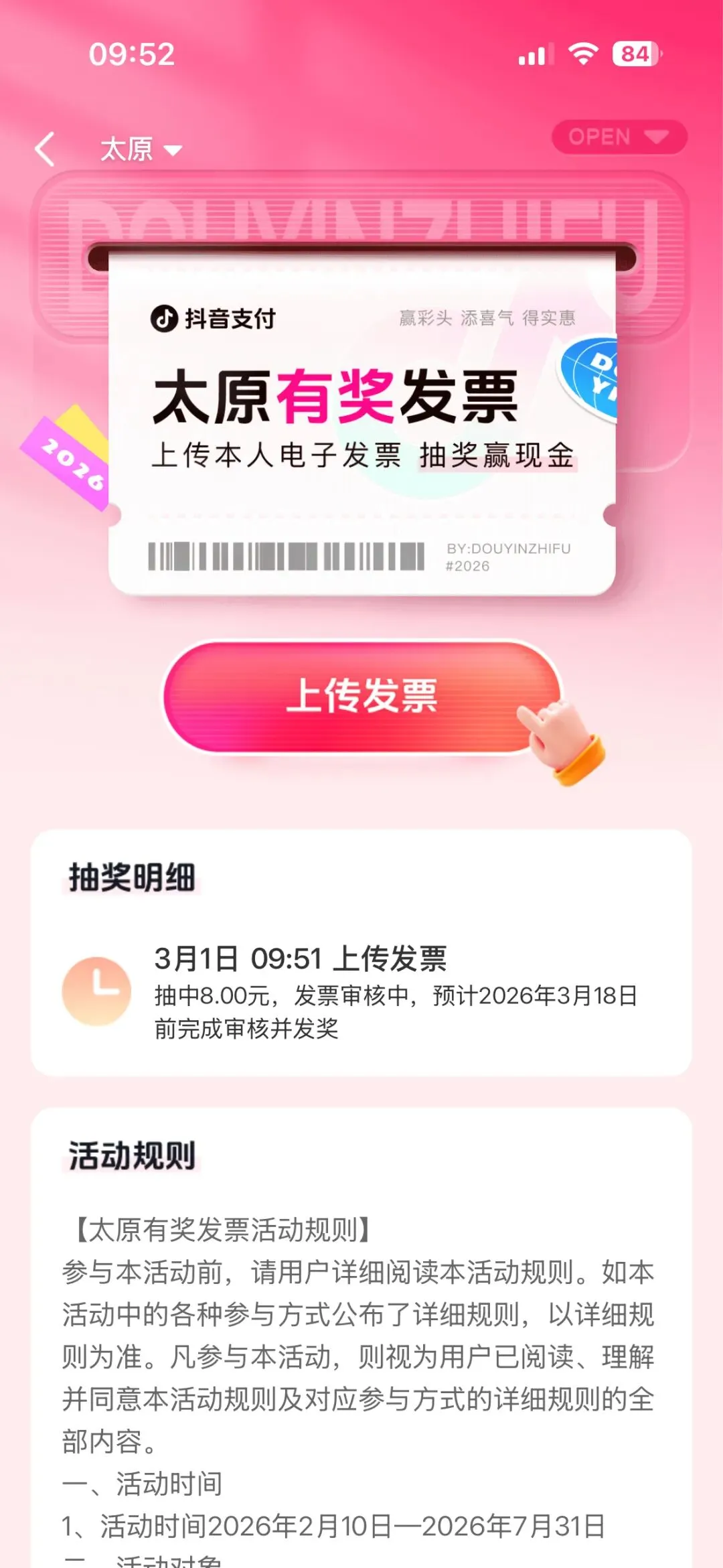 太原市的有奖发票试点活动于2026年2月10日启动,将持续至7月31日,覆盖零售、餐饮、住宿、文化艺术、旅游、娱乐、体育、居民服务等八大行业。只要在太原市行政区域内消费并取得票面金额不低于100元的全面数字化电子发票,即可参与抽奖,最高可中10万元。
