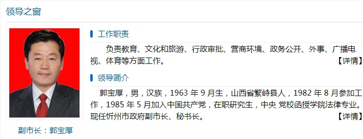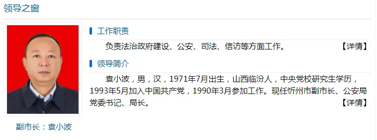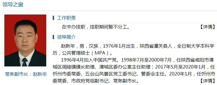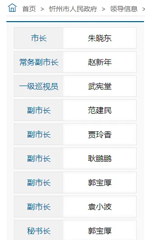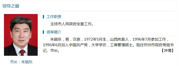 领导简介:朱晓东,男,汉族,1972年5月生,山西岚县人,1996年7月参加工作,1996年6月加入中国共产党,大学学历,工商管理硕士。现任忻州市政府党组书记、市长。领导简介:赵新年,男,汉族,1976年1月出生,陕西省潼关县人,全日制大学本科学历,公共管理硕士(MPA)。1996年4月加入中国共产党。1998年7月至2000年7月,任陕西省咸阳市渭城区周陵镇镇长助理、渭城区委办公室主任助理;2017年5月至2020年1月,任忻州市委常委、五台山风景区党工委书记、管委会主任。2020年1月,任忻州市委常委、市政府党组副书记、常务副市长。工作职责:负责财政、自然资源、生态环境、住房和城乡建设管理、应急管理、安全生产、煤炭行业安全监管、消防等方面工作。领导简介:武宪堂,男,汉族,1963年2月生,山西省五台县人,中央党校大学学历,经济师、高级政工师。1993年6月加入中国共产党,1981年10月参加工作。工作职责:负责发展改革、科技、工业、商务、口岸、扩大开放、招商引资、国企国资监管、金融、能源产业、开发区建设管理等方面工作。领导简介:范建民,男,汉族,1966 年11 月生,山西省偏关县人,大学学历,工程硕士。1996 年12 月加入中国共产党,1990 年9 月参加工作。2016 年9 月任忻州市政府市长助理、党组成员;2016 年10月当选为忻州市人民政府副市长。工作职责:负责民生、卫生健康、退役军人事务、市场监管、医疗保障等方面工作。领导简介:贾玲香,女,汉族,1965年3月生,山西省代县人,中央党校大学学历。1997年6月加入民盟,1984年8月参加工作。工作职责:负责人力资源和社会保障、交通运输、农业农村、扶贫、水利等方面工作。领导简介:耿鹏鹏,男,汉族,1979年6月出生,山西晋城人,1999年8月参加工作,1999年7月加入中国共产党,研究生学历,法学硕士学位,正高级工程师。现任忻州市政府副市长。工作职责:负责教育、文化和旅游、行政审批、营商环境、政务公开、外事、广播电视、体育等方面工作。领导简介:郭宝厚,男,汉族,1963 年 9 月生,山西省繁峙县人,1982 年 8 月参加工作,1985 年 5 月加入中国共产党,在职研究生,中央 党校函授学院法律专业。现任忻州市政府副市长、秘书长。工作职责:负责法治政府建设、公安、司法、信访等方面工作。领导简介:袁小波,男,汉,1971年7月出生,山西临汾人,中央党校研究生学历,1993年5月加入中国共产党,1990年3月参加工作。现任忻州市副市长、公安局党委书记、局长。工作职责:负责教育、文化和旅游、行政审批、营商环境、政务公开、外事、广播电视、体育等方面工作。领导简介:郭宝厚,男,汉族,1963 年 9 月生,山西省繁峙县人,1982 年 8 月参加工作,1985 年 5 月加入中国共产党,在职研究生,中央 党校函授学院法律专业。现任忻州市政府副市长、秘书长。6月10日,大同市政府办《关于市长副市长秘书长等工作分工的通知》公开发布,精读如下。