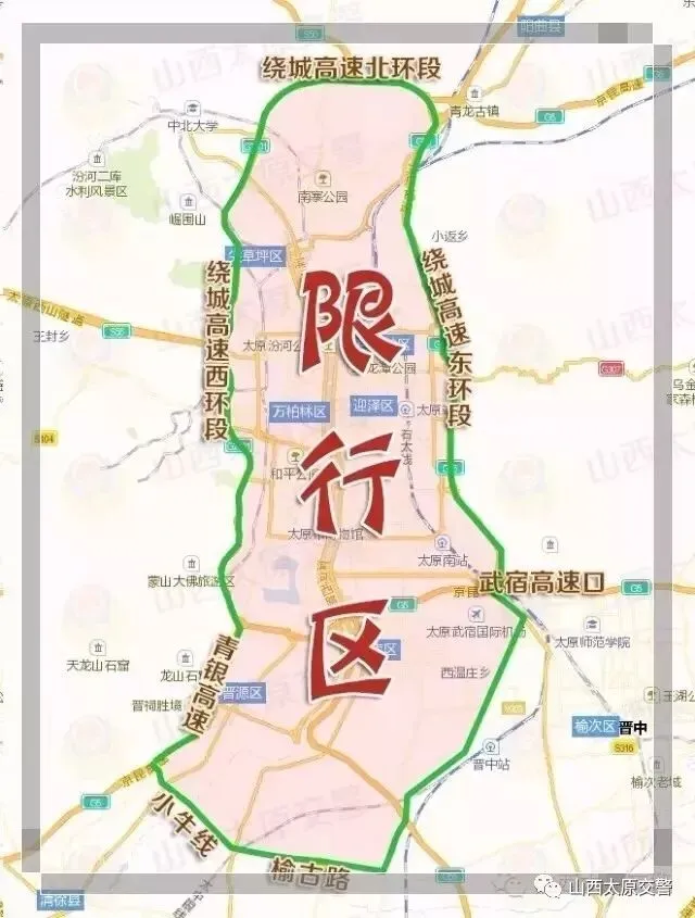 绕城高速东环段、太榆路(武宿高速口至晋中段)以西,绕城高速北环段以南,绕城高速西环段、青银高速(太原罗城至清徐段)以东,小牛线、榆古路以北(不含上述道路)道路范围内。进入限行区域道路行驶的所有机动车(含非本市车辆)实施尾号限行管理(尾号为英文字母的以最后一位数字为准),单号单日通行,双号双日通行,具体情况:公共汽车、出租车、长途客运车(含旅游客车)、经公安交通管理部门核定的校车以及通勤大中型载客车;执行任务的制式警用车、制式执法车、消防车、救护车、清障车;环卫、园林、道路养护的专项作业车辆及殡葬专用车辆、新能源号牌车辆。以上车辆属中重型载货车、专项作业车的,须办理“限行区域通行证”方可通行。限行期间,市内公交车全部免费乘坐(不含太原至晋中城际公交线路);倡导“文明交通、绿色出行”,倡议市民选择“公交车、自行车、步行”等绿色出行方式;限行期间,滨河东路、滨河西路部分路段高峰期限行调控措施,暂停执行;其他交通管理措施仍然有效,对违反规定的机动车,公安机关交通管理部门将依法处理。相关阅读